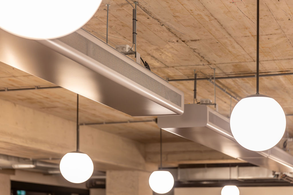 Spaces Vijzelstraat is bruisende coworklocatie met een modern en industrieel design. Wij hebben hier diverse Halton Rex REE vrijhangende inductie-units geleverd, een gecombineerde unit voor koeling, verwarming en ventilatie.